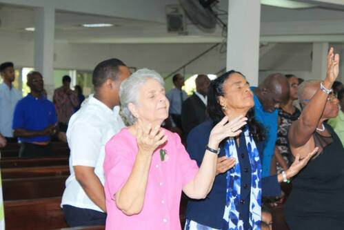 "CHEERS BUT NO CHAIRS" reported the Nation, the leading newspaper's front page headline. Pastors Cuke, Basil Yarde and Terry Frith has rented seating for 300 but over 600 persons turned up for that first service.