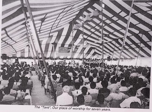 Services in the Tent which was designed to seat 1 000 persons began on the Sunday afternoon of June 27, 1982 and continued until we moved into a new Sanctuary on September 22, 1990. Eight years in a tent that the manufactures said would last about three years. The last few months before into the Sanctuary, whenever the rain fell the umbrellas went up!